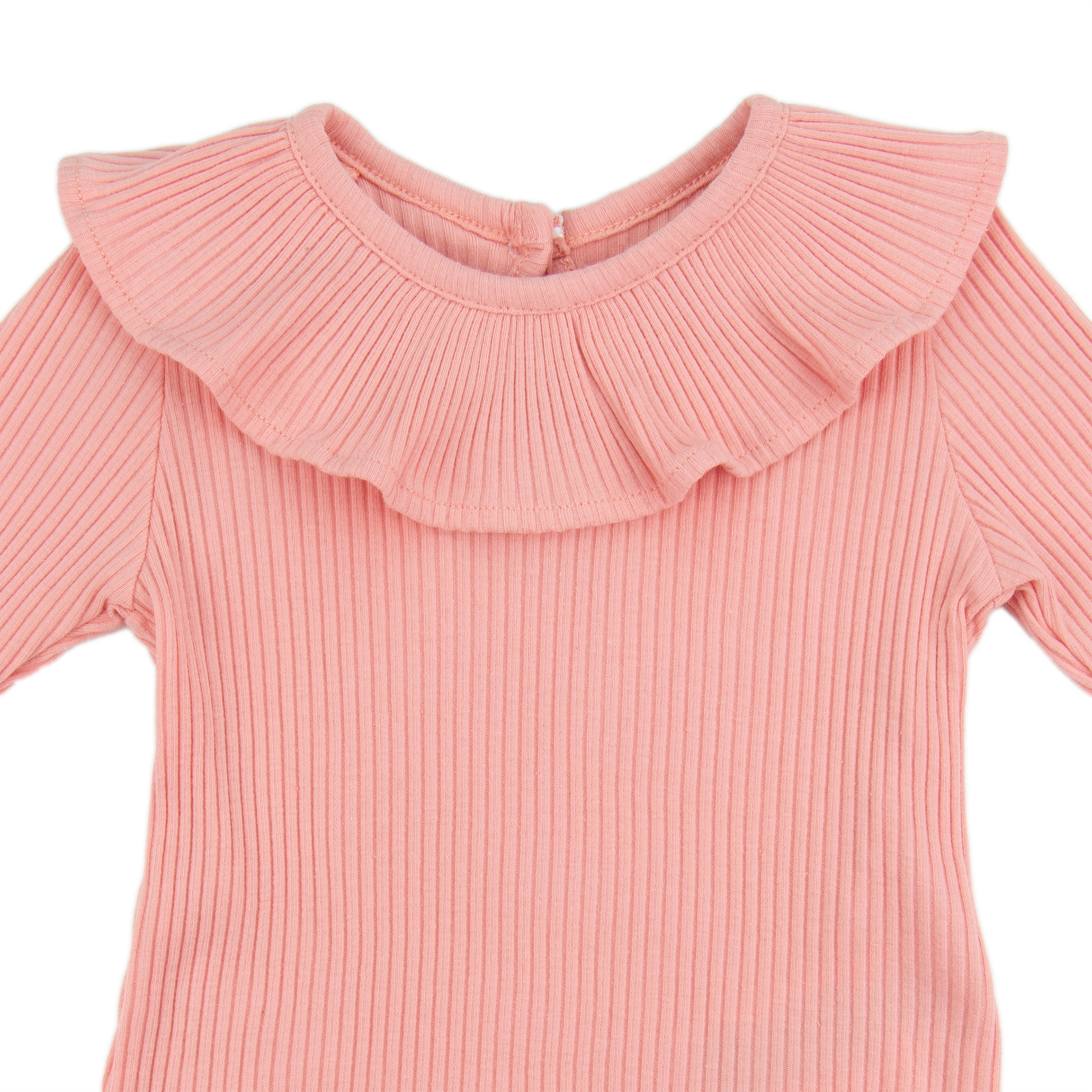 Ribbet body med volanger i halsen. Åpnes og lukkes med knapp i nakken og mellom ben. Laget av bomull.