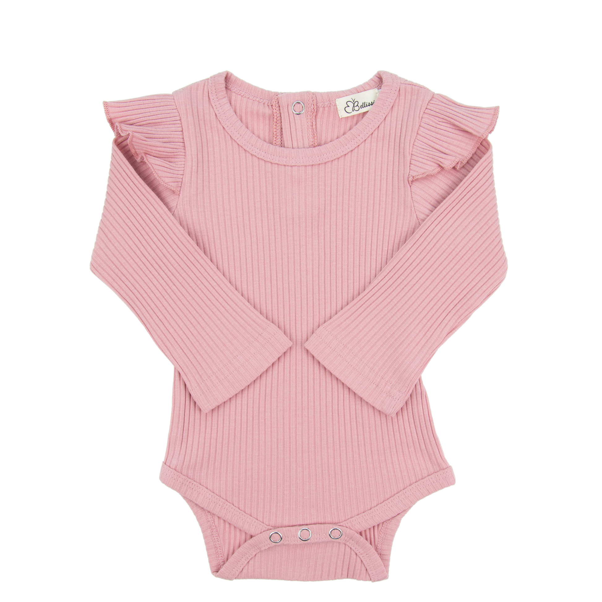 Myk og lett ribbet body med fine volanger på skuldrene. Åpnes og lukkes med knapper bak på ryggen. Laget av bomull.