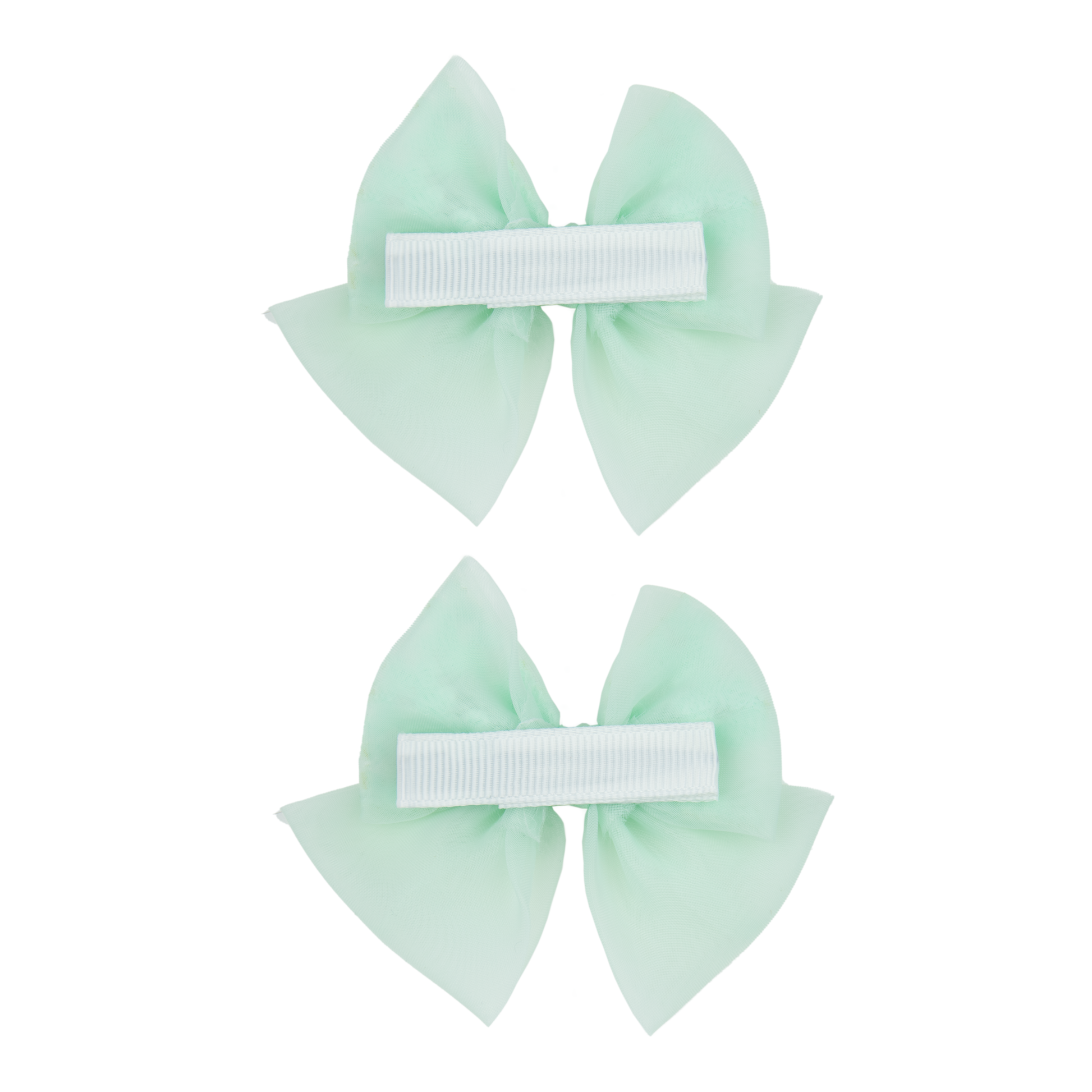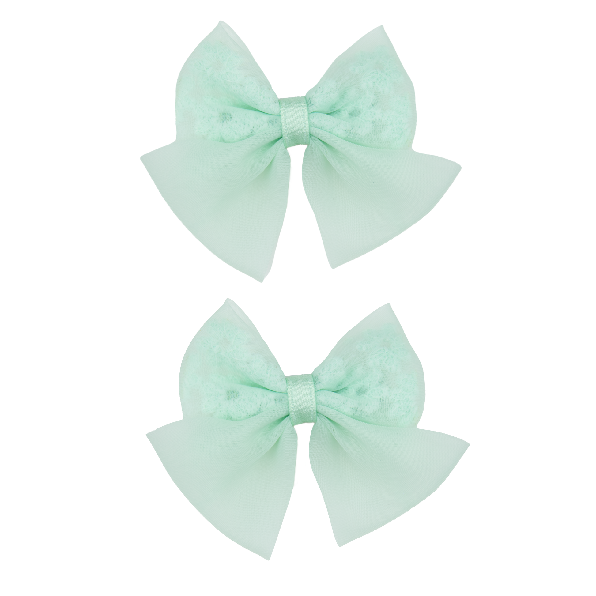 2 stk lekre hårsløyfer på klemmer i organza. Under ytterlaget er det fine blomsterdetaljer. Hårsløyfen er 6 cm bred og ca 5 cm høy.