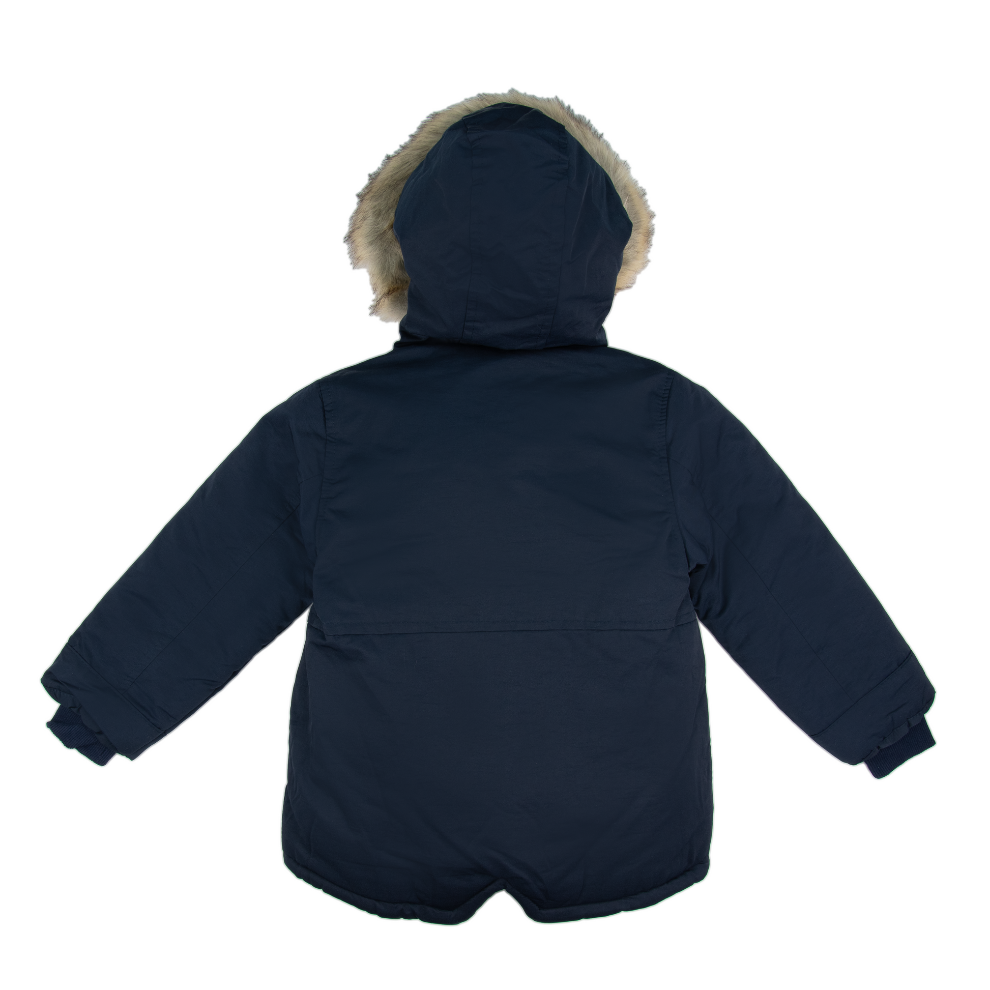 Vattert parkas med myk fôr på innsiden og vannavisende stoff på utsiden med vindstopper over glidelåsen. Jakken har hette med fuskepels og fine knappedetaljer på jakkens fremside.