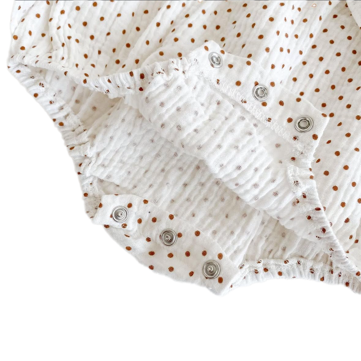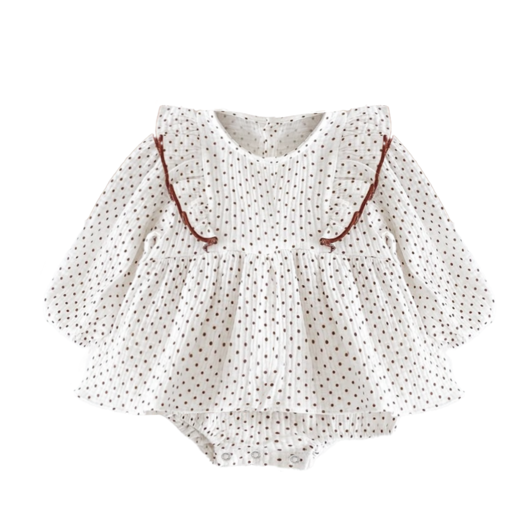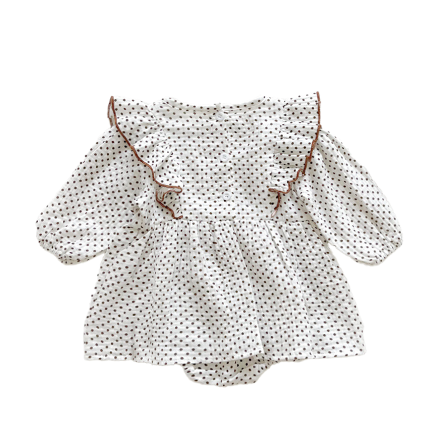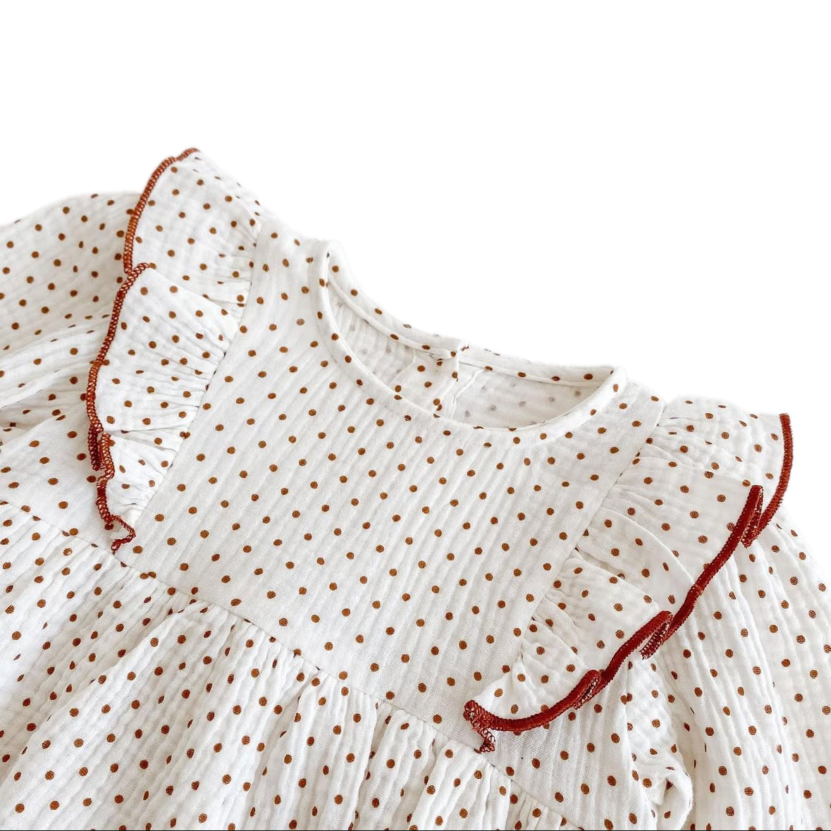 En lett og luftig kjole i myk musselin av bomull med søte volanger på bryst og på ryggen. Kjolen åpnes og lukkes med knapper i ryggen og trykknapper mellom ben for enkel bleieskift.