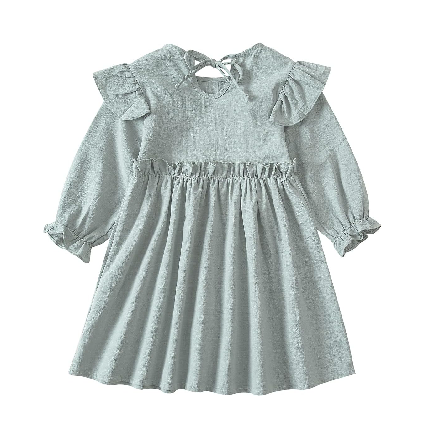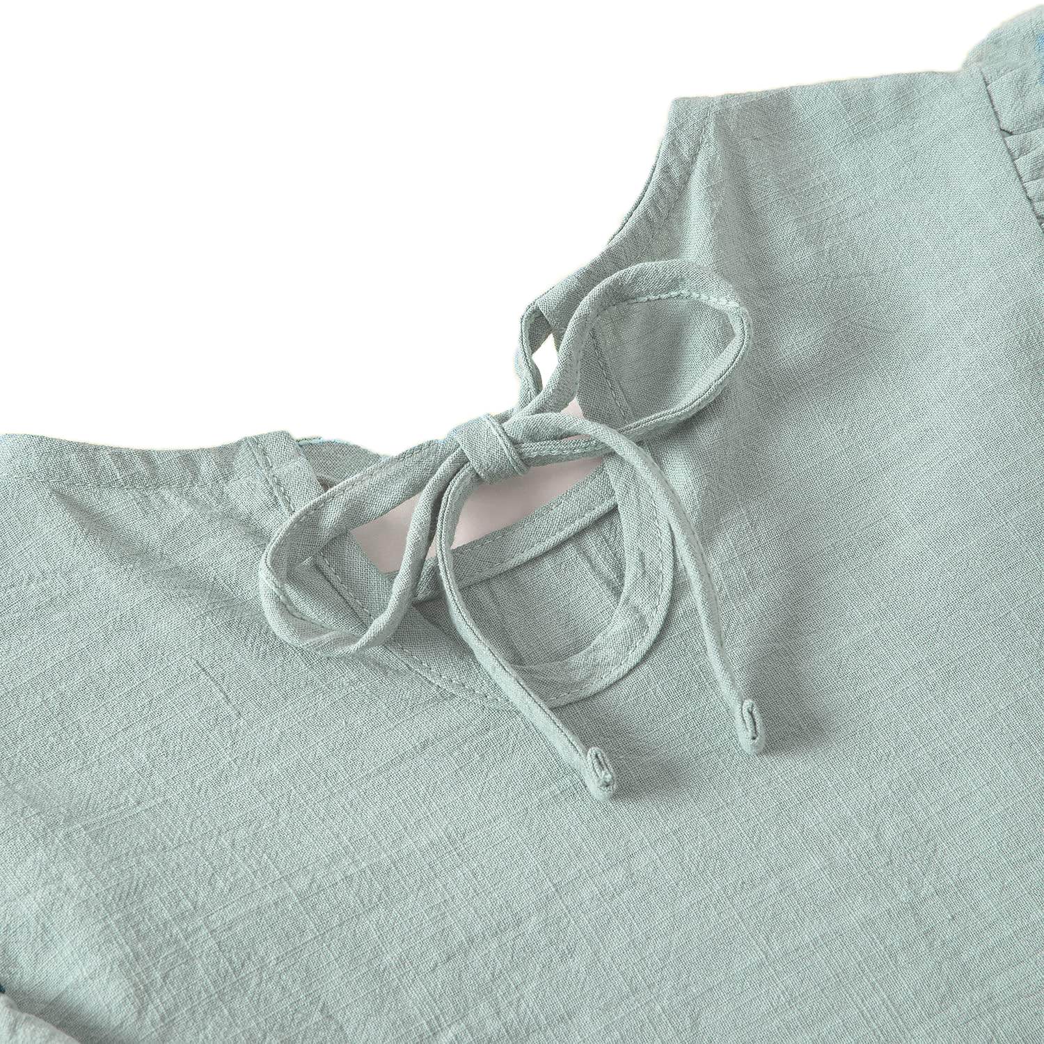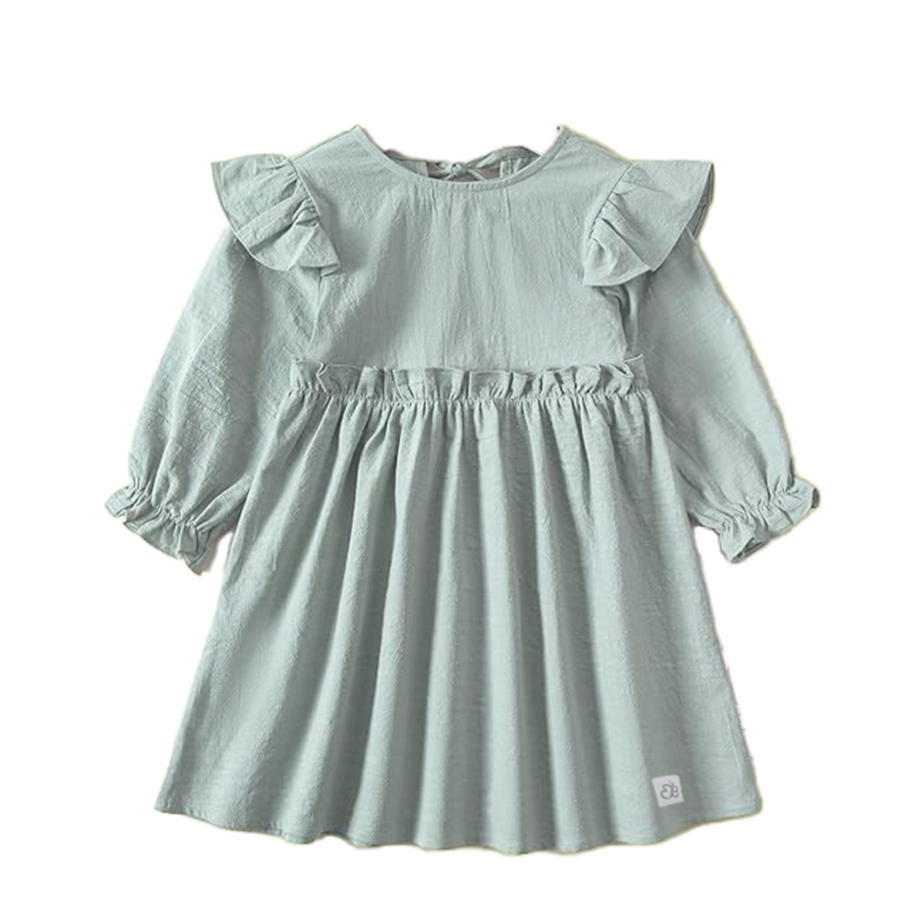 En søt kjole med lange ermer og flere fine detaljer. Den har volanger på skuldrene og i livet. Kjolen har knytesnor i nakken for lettere av- og påkledning. Laget av 100% bomull.