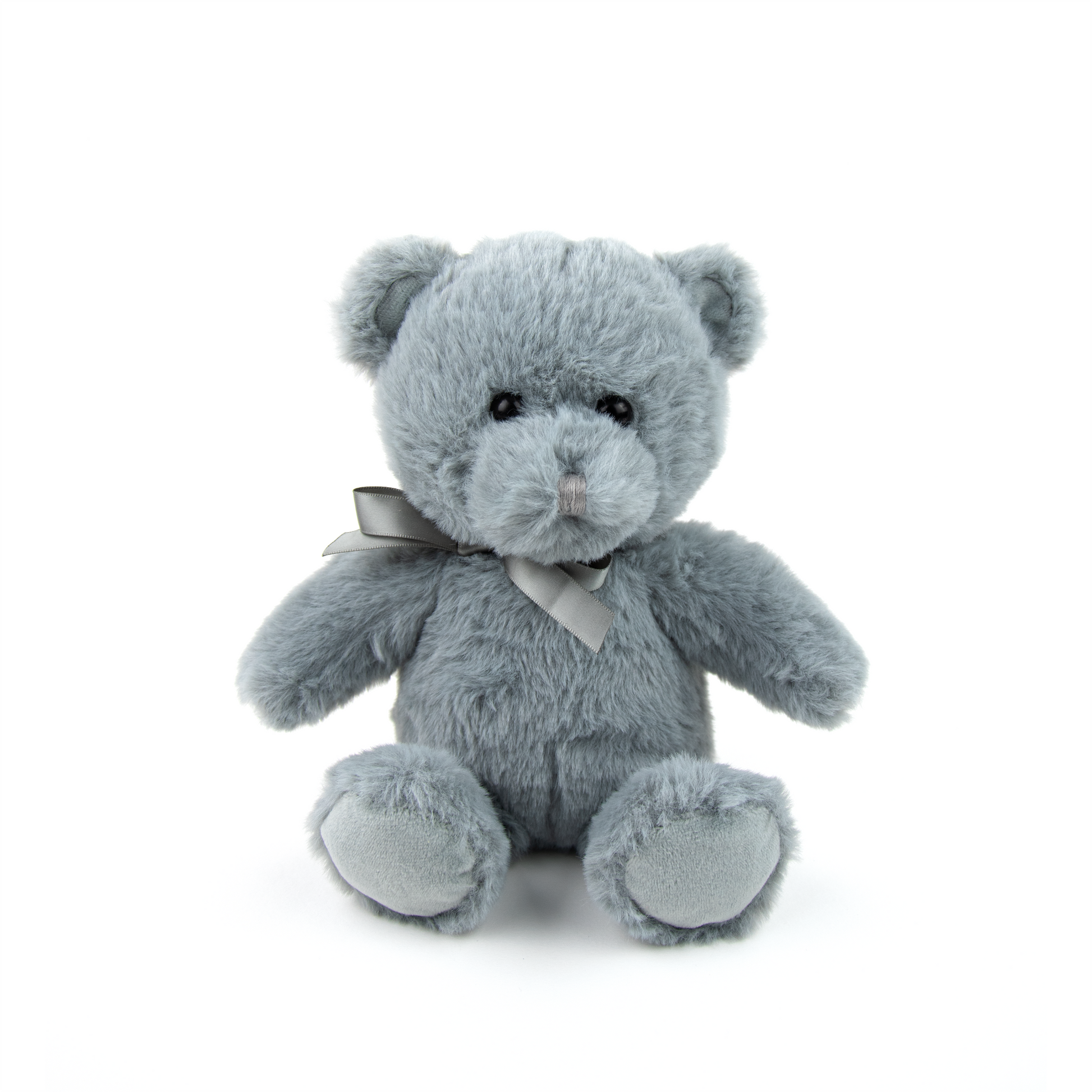 Myk og god teddybamse med kort hår og sløyfe i halsen. Måler ca 22 cm høy i sittende stilling.