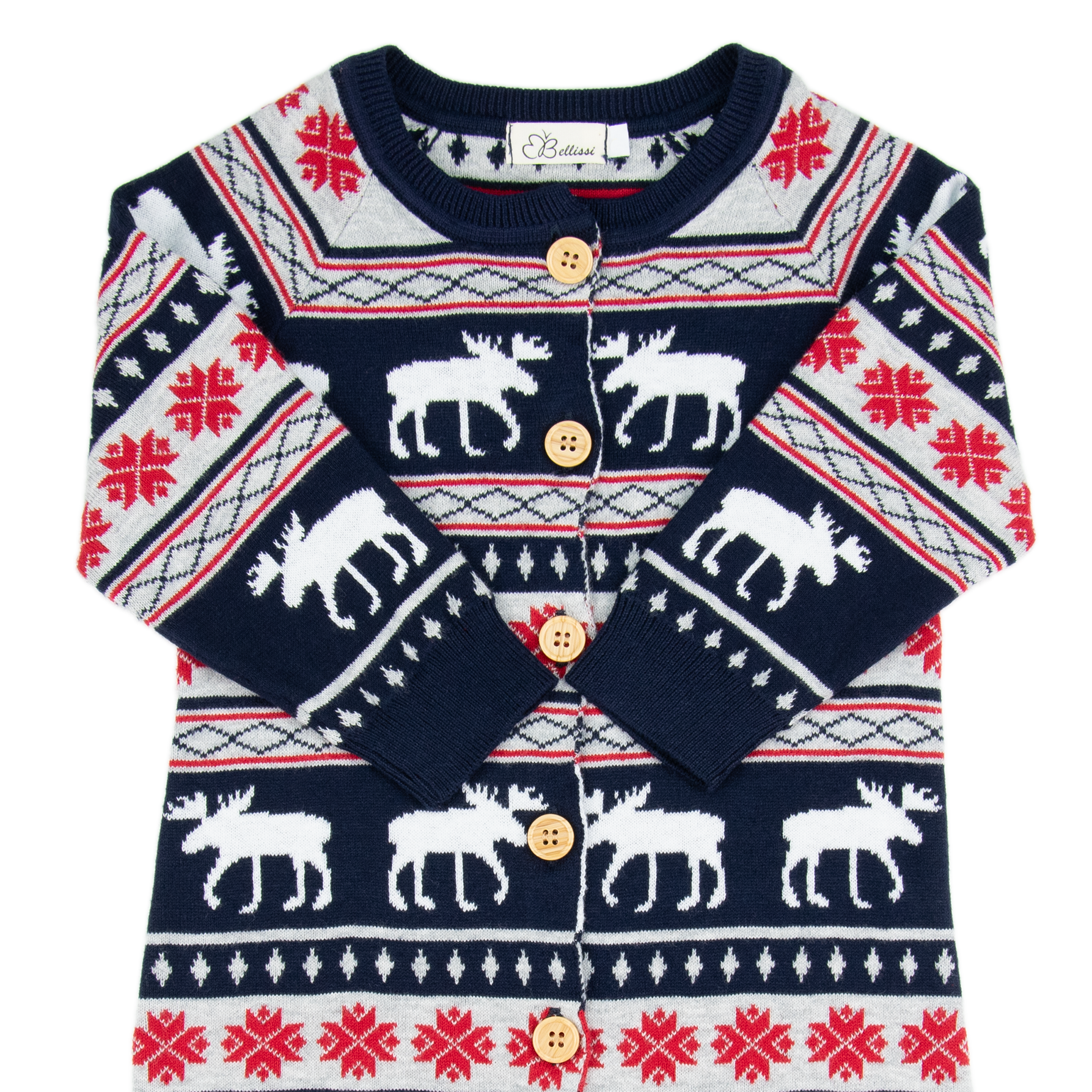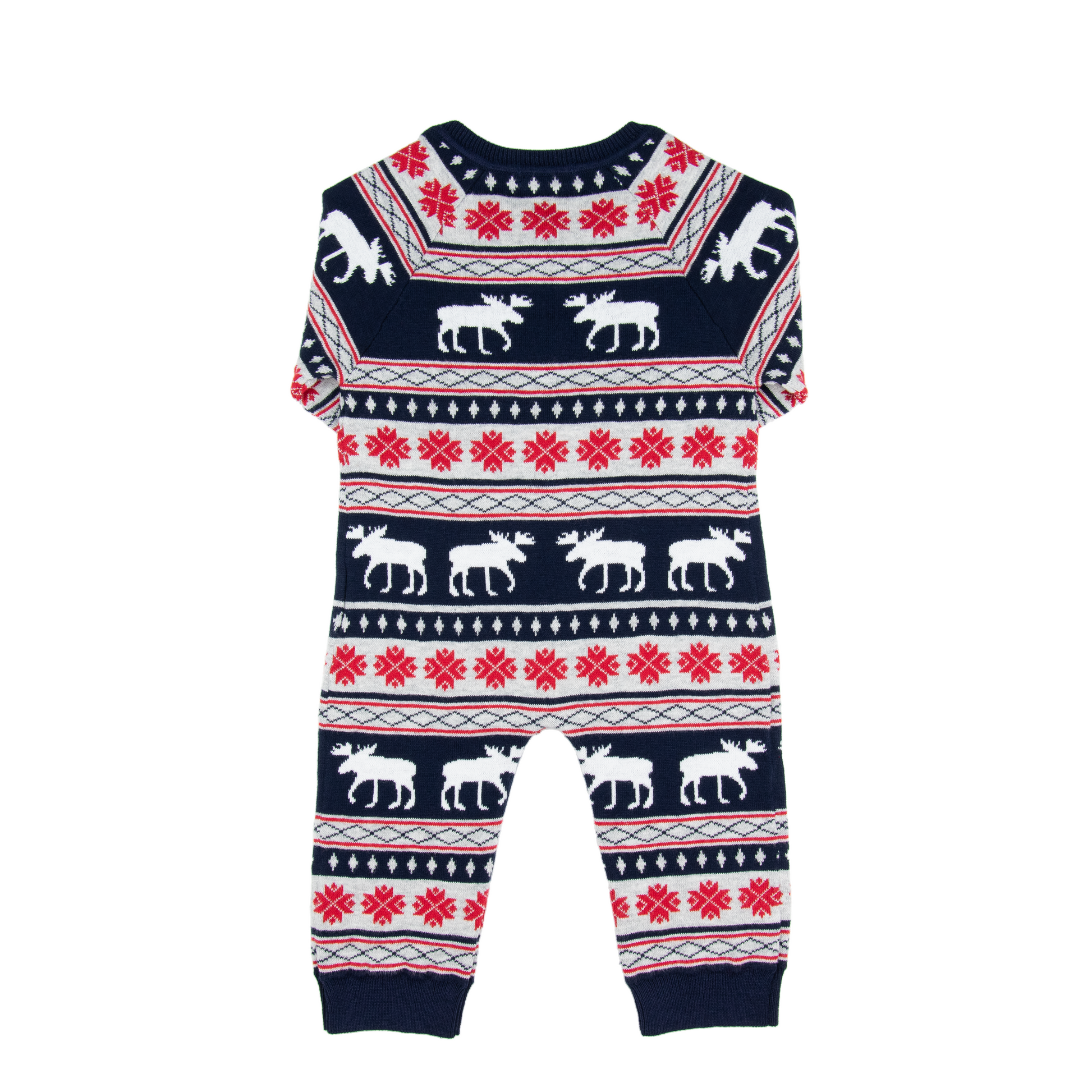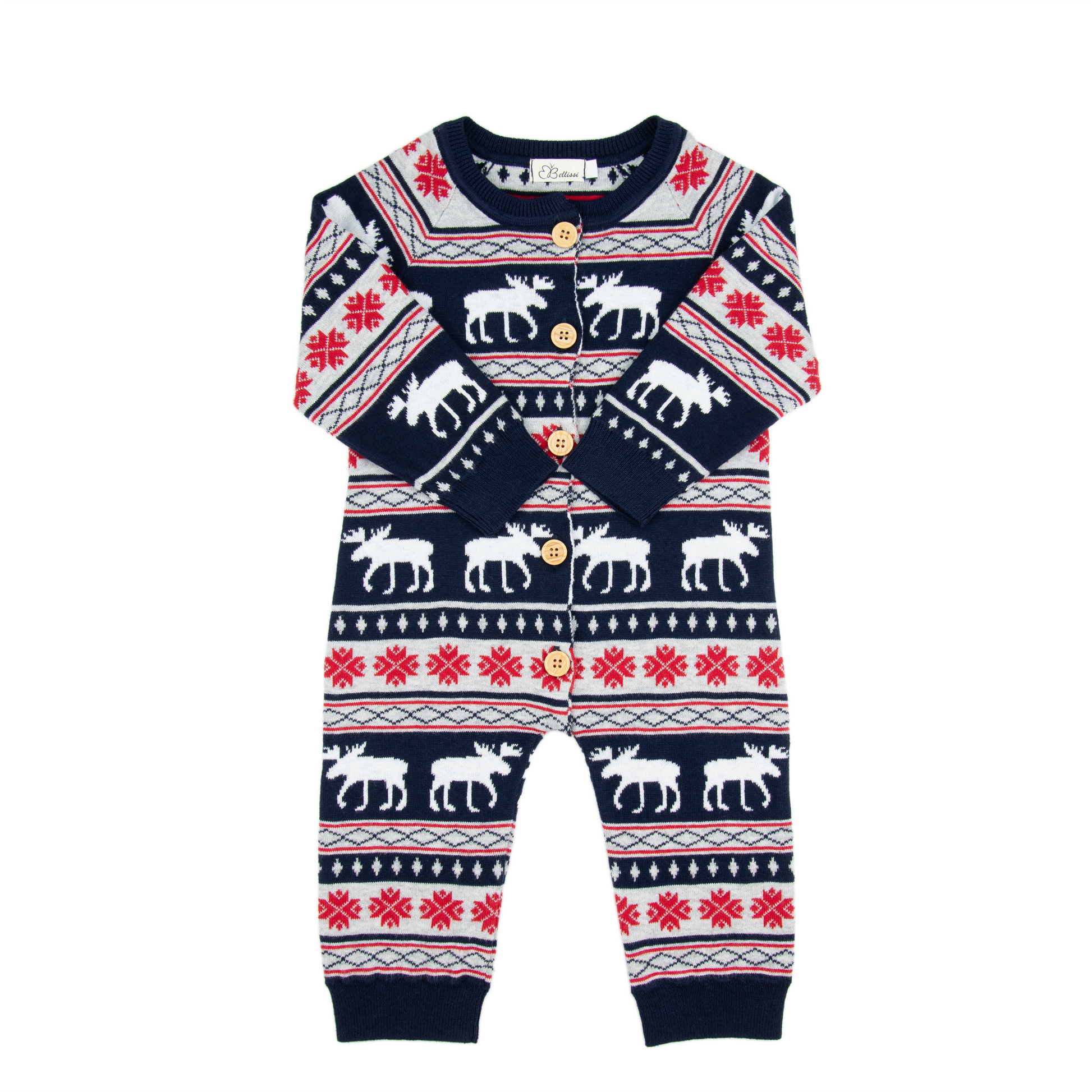 Myk og tynnstrikket overall med et juleinspirert strikkemotiv. Åpnes og lukkes med knapper foran. Laget av bomull.
