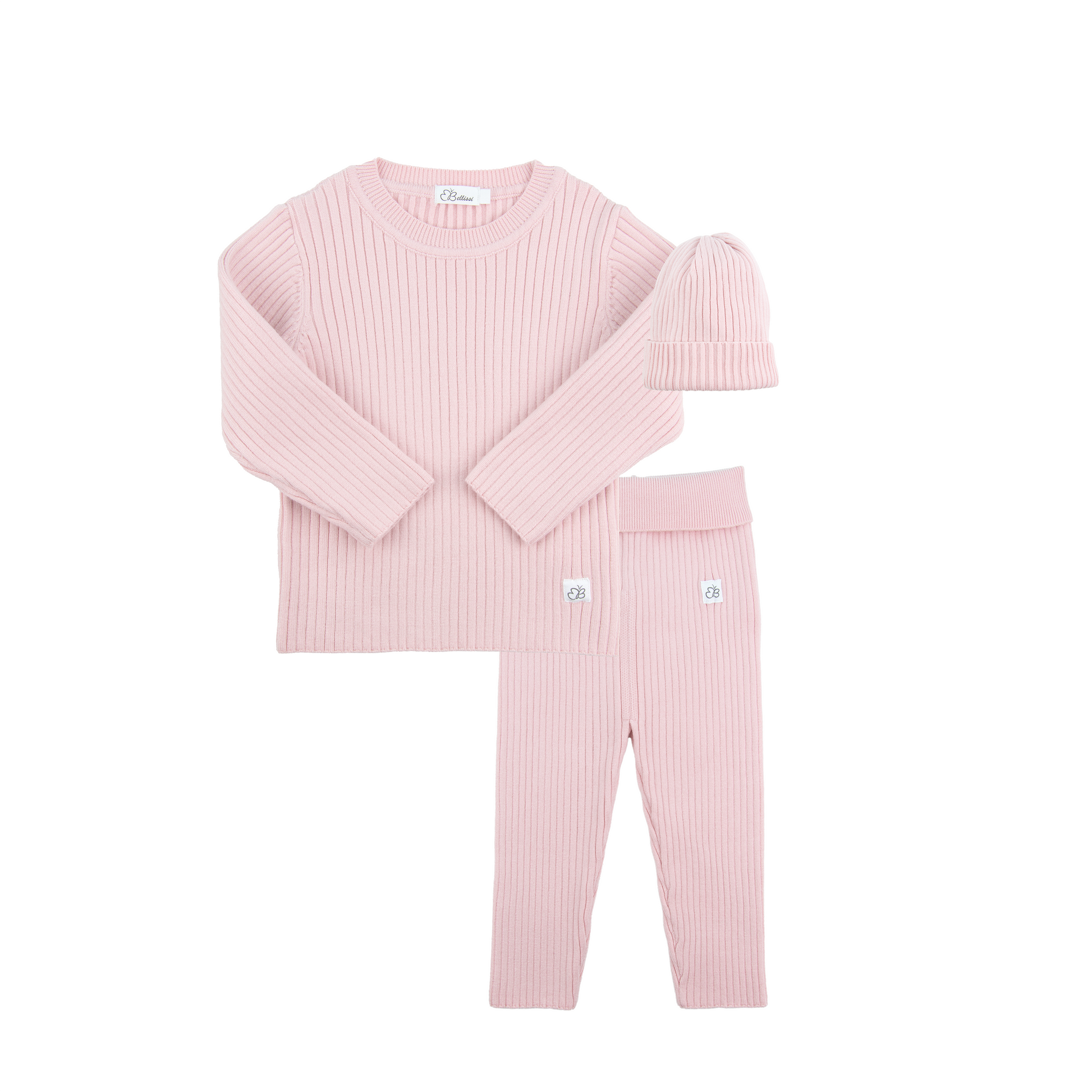 Tykk og mykt sett med ribbet klær som inneholder bukse, genser og lue. Klærne er god å ha på seg på de kjøligere dagene. Laget av 50% viskose og 50% bomull.