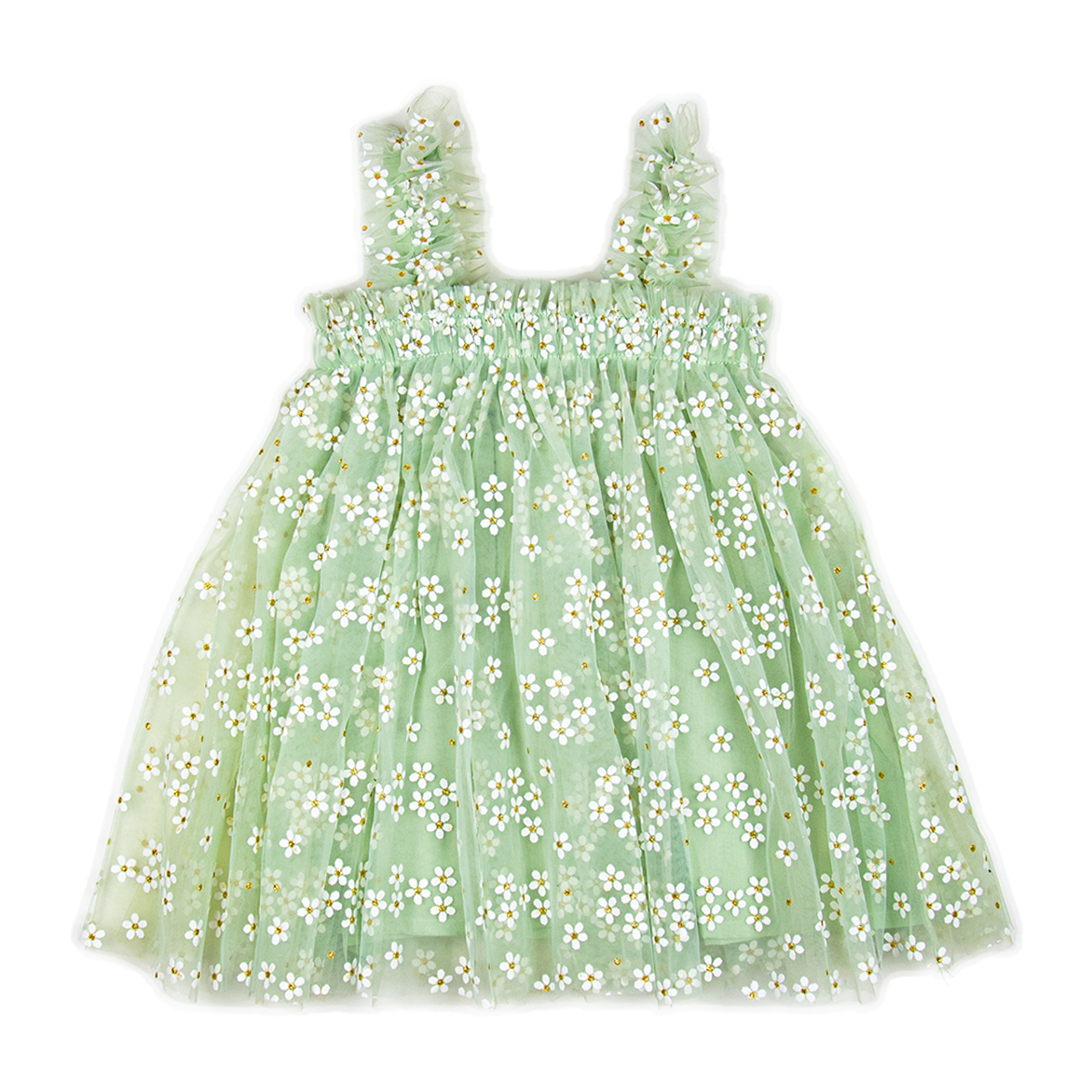 Søt tyllkjole med mange lag tyll og tylldekorerte stropper. Ytterste laget med tyll har også søte hvite blomstertrykk. Varen er liten i størrelsen så en størrelse større anbefales.